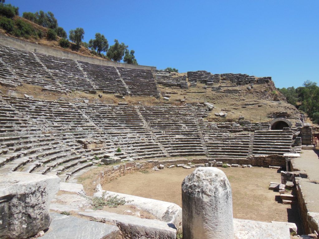 But it was worth it. Though never an important city, Nysa could afford the usual complement of grand civic monuments. And here, unlike so many other places, no substantial settlement grew up in the ruins, so many of the city’s buildings have been well preserved. The gymnasium, where I parked my car, was a relatively unimpressive ruin. But the sheer size of the adjacent amphitheater, a massive building cut into a steep ravine, more than compensated. The actual seating has only been uncovered in a few areas; but vaults emerge jagged from the scrub on every side of the valley, creating a general impression of monumental size.