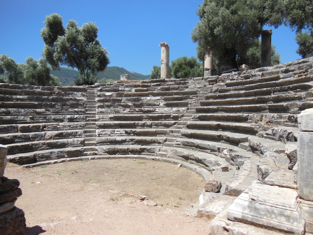 The tunnel led me across to the other side of the city, where recent excavations have begun to uncover long stretches of a magnificent colonnaded avenue. At one end of a new pit, the jumbled blocks of a monumental gateway have been uncovered, lying as they fell in some medieval earthquake. I followed the line of the old street past a row of vaulted shops to the ruins of the bouleuterion (council chamber).