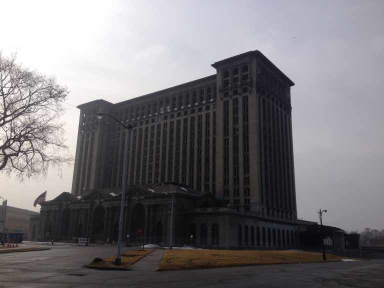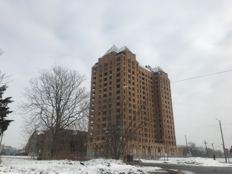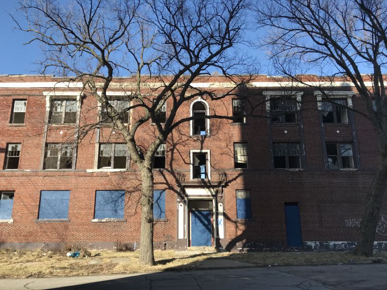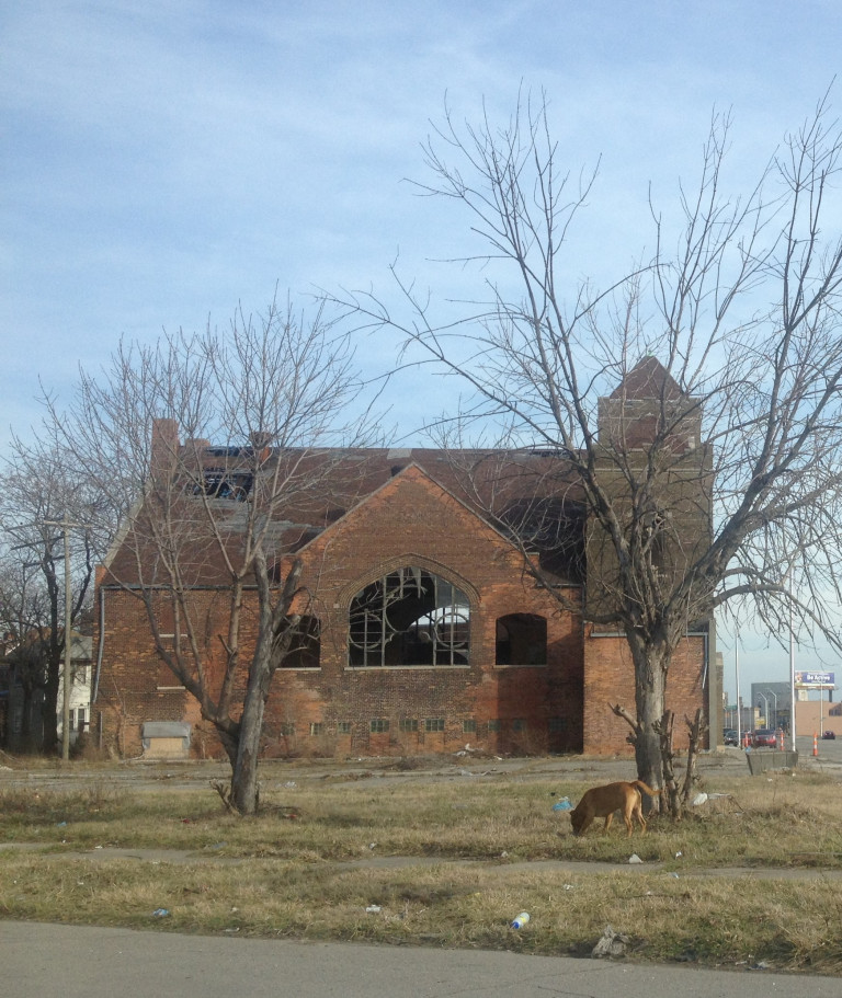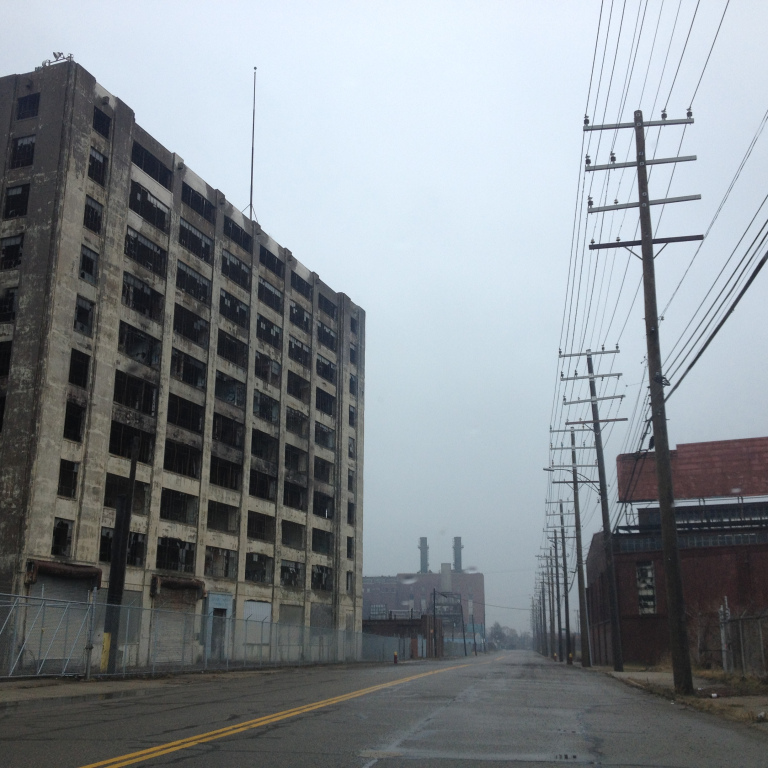 Northwest, I followed Grand River and adjacent streets through a long series of sadly deteriorated neighborhoods, where the broken windows of Art Deco apartment buildings overlooked rows of vacant and gutted homes.