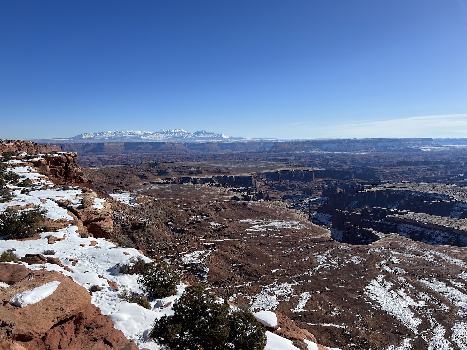 Stomach ballasted with breakfast waffle, I continued my westward trek through a perfect winter day: crisp, calm, and clear, with a temperature in the mid-twenties. My eagerness to hit the trail made the ride to Canyonlands National Park, my first destination, seem longer than it was. When I finally entered the park, I drove to the end of the road, parked in the lonely lot, and walked reverentially to the mesa rim. Below was the view I had driven a thousand miles to see: an infinite tracery of canyons, buttes, and mountains, all dusted with snow.