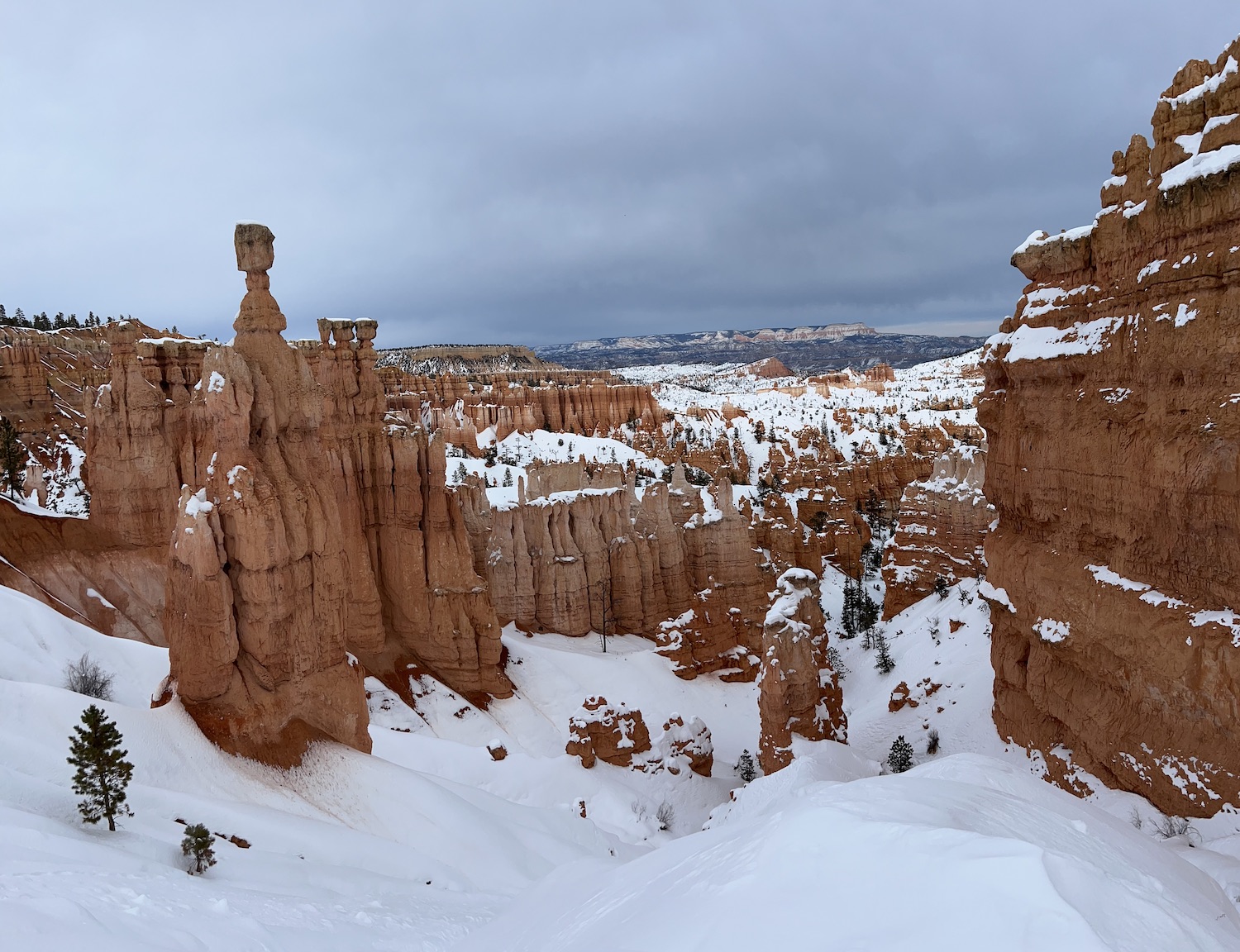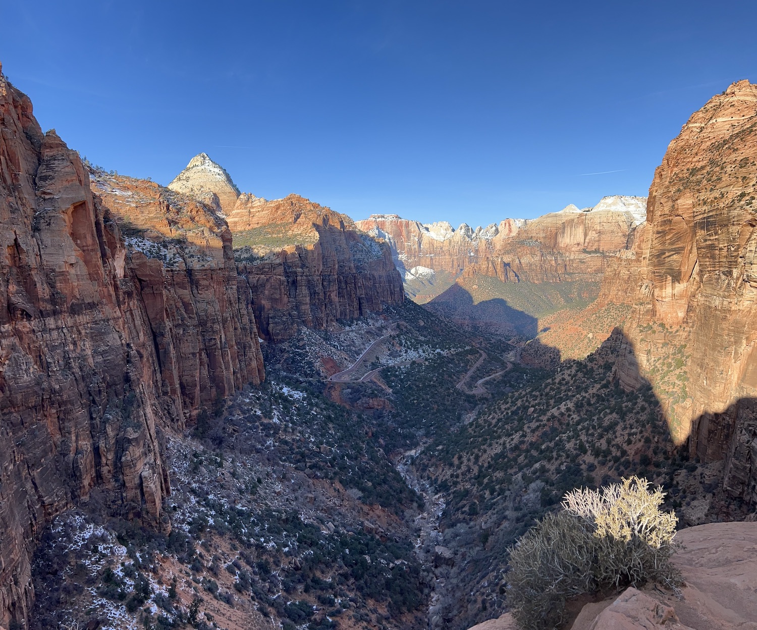 My destination was Zion National Park. In 2016, I made the mistake of visiting during Memorial Day weekend, and spent three days fighting the hordes at Angel’s Landing, the Narrows, and the park’s other iconic hikes. This time, in delightful contrast, the crowds were light. I began at the Canyon Overlook trail, which – as might be expected – overlooks a canyon. But even this jaded traveler was impressed by that spectacular panorama of snow-dusted stone, glowing softly against the rising sun.