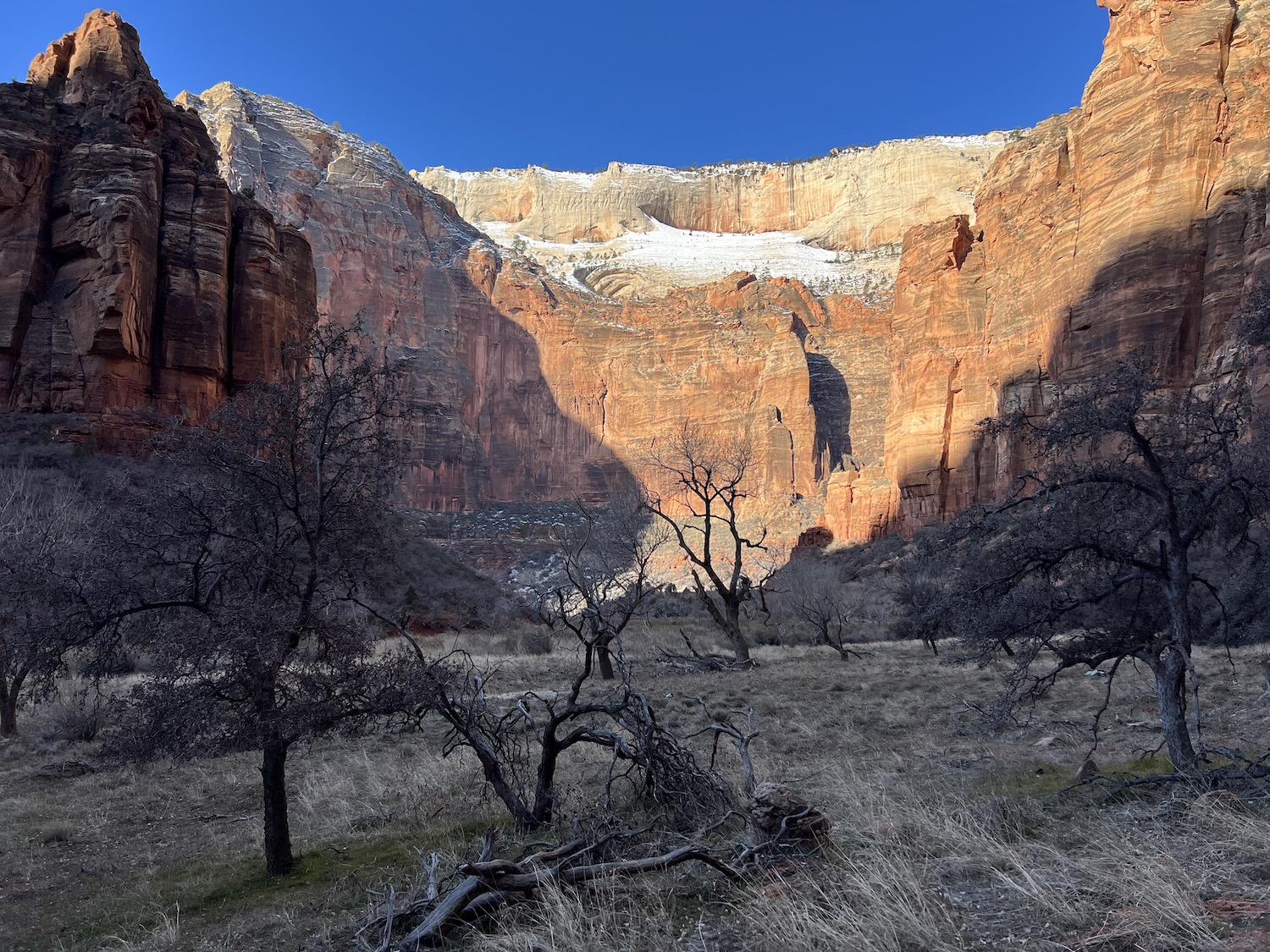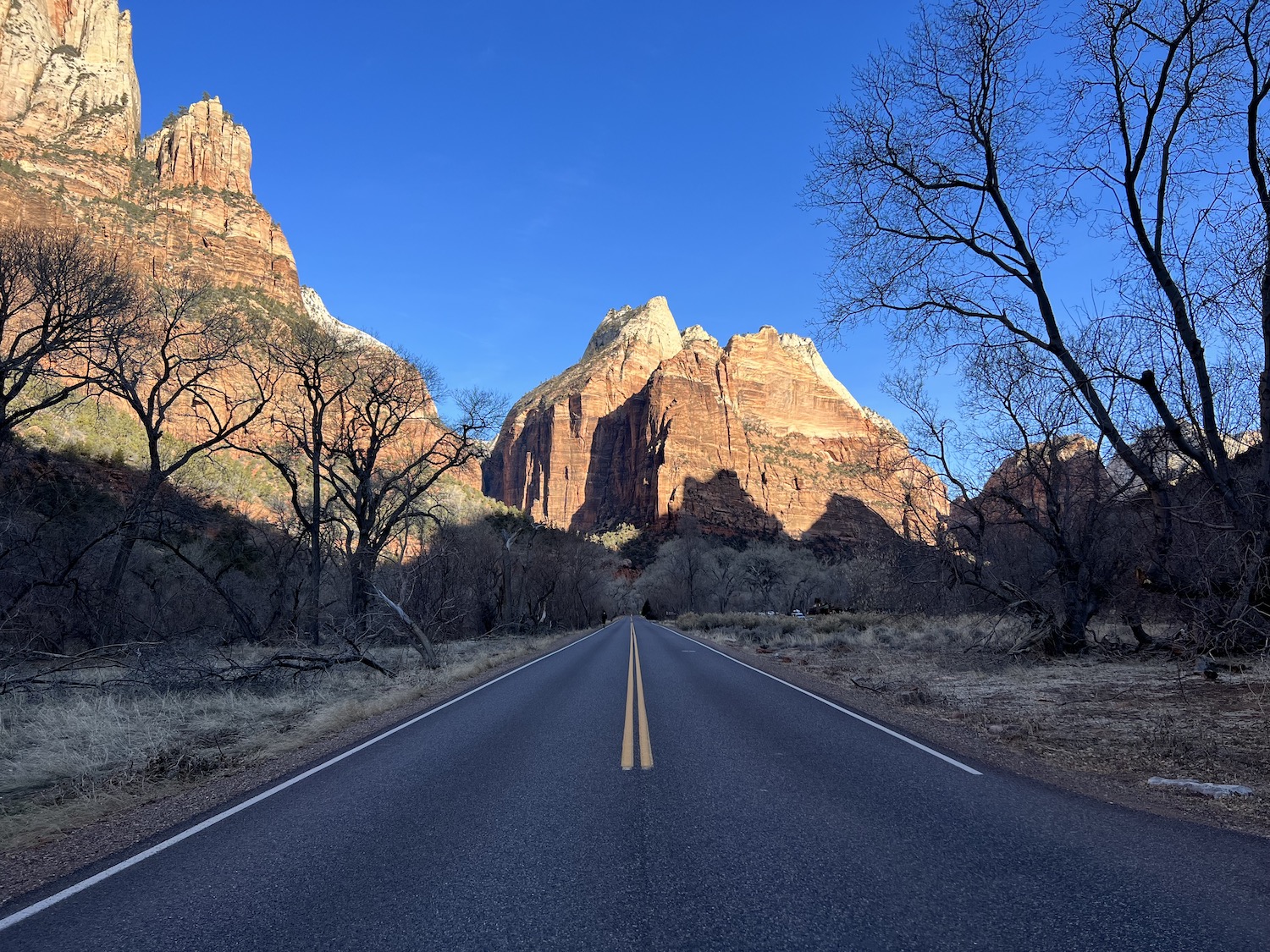 In the summer months, visitors to Zion are required to use shuttles departing from the visitor center to access the hikes along the main canyon. The hardy few who visit in winter, however, can drive their own vehicles to the end of the canyon road. I did so, pausing again and again on pullouts and shoulders to take in the sheer visual drama of the sandstone peaks, kissed by morning light.