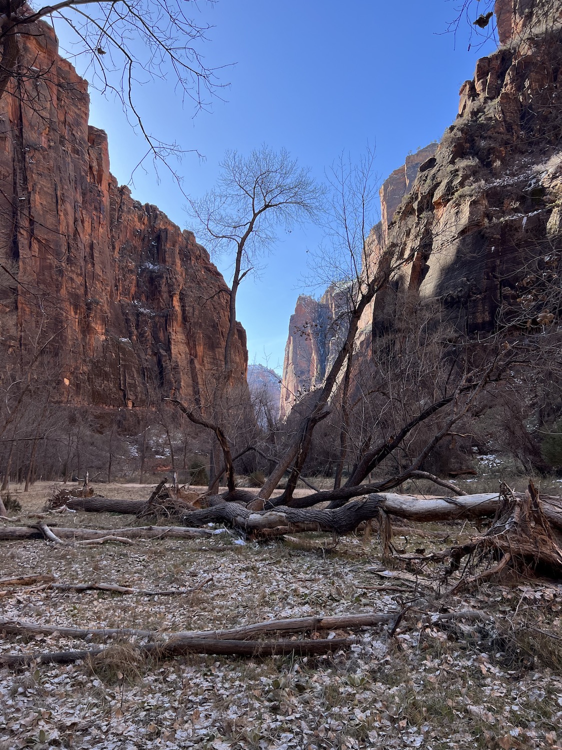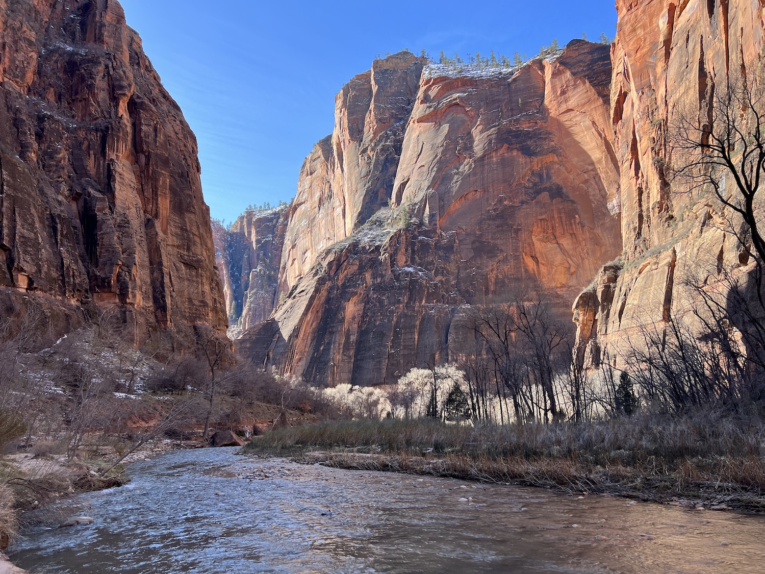 At the road’s end, where the canyon contracts to the ribbon-thin Narrows, I parked and walked a mile or so along the Virgin River, snapping picture after picture of the soaring cliff walls, veined with ice and framed by the bare branches of cottonwoods.