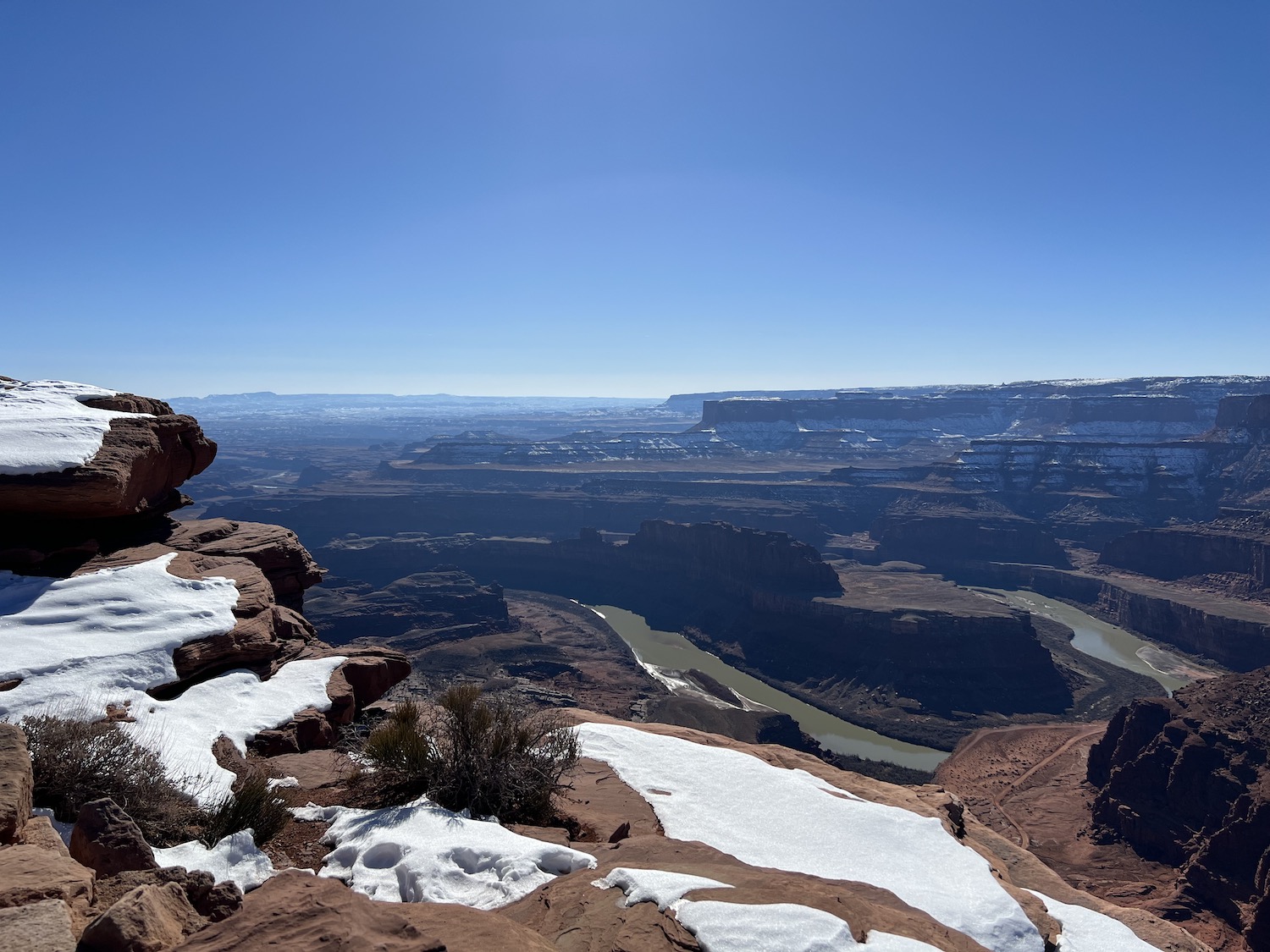 On the way out, I stopped at Dead Horse Point State Park. Though ambitiously priced – and not covered by my National Park pass – the park occupies a long spit of long that juts out over the Colorado River valley, providing spectacular views of the river, its red canyon, and the mountains beyond.