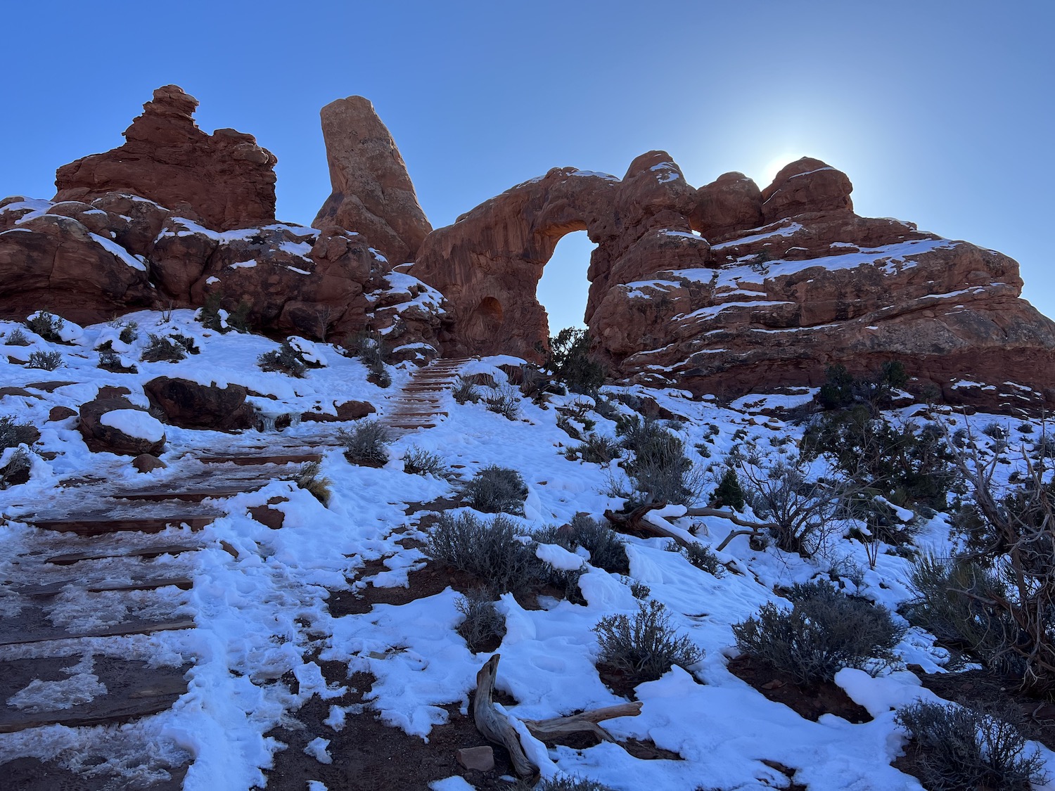 In mid-afternoon, as a swollen moon began to peer over the eastern horizon, I entered the otherworldly landscape of Arches. During my last visit, in May 2016, the park had been overrun by visitors. Now, though not quite as deserted as Canyonlands, it was mostly empty. During a leisurely walk around the arches known as the Windows, I found myself drawn to Turret Arch, which presided over the snowy landscape with the solemnity of a primeval temple.