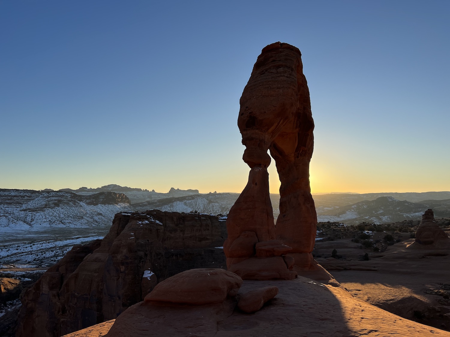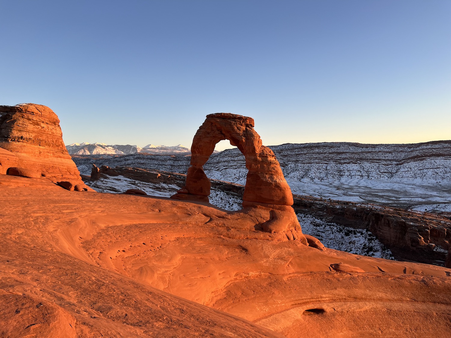 I saved the best for last. Delicate Arch – the famous, fragile ribbon of sandstone that appears on Utah license plates – stands at the top of a stiff two-mile climb. After strapping on my spikes to negotiate a treacherously icy stretch of the path, I emerged at the ridgetop overlook, and was confronted by the arch, brilliant against a backdrop of snowy mesas and peaks, ethereal as the gate of a ruined palace. As the sun set, the arch’s color deepened from rose to crimson to bloodred.