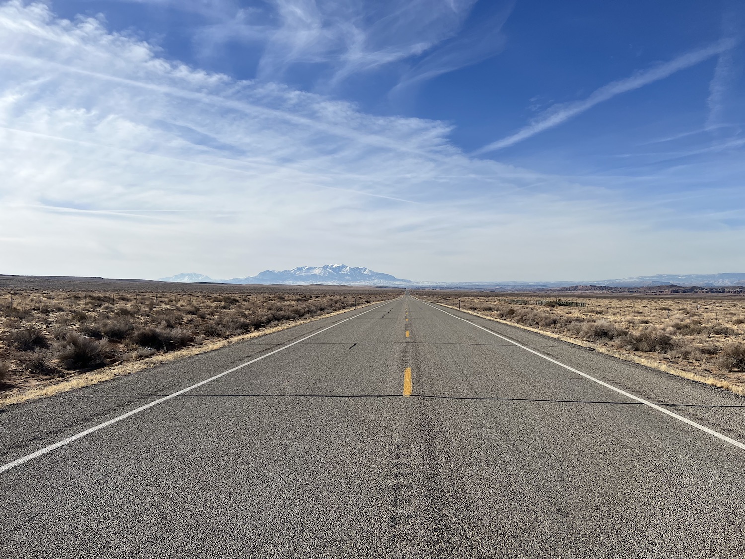 I had forgotten how desolate south-central Utah is. Along a hundred miles of two-lane highway, I saw only a dozen or so cars, and two untidy jumbles of buildings bold enough to proclaim themselves towns. The landscape was a Biblical desolation – deserts of broken rock and snow-striped sand, from which mesas jutted like ruined cathedrals.