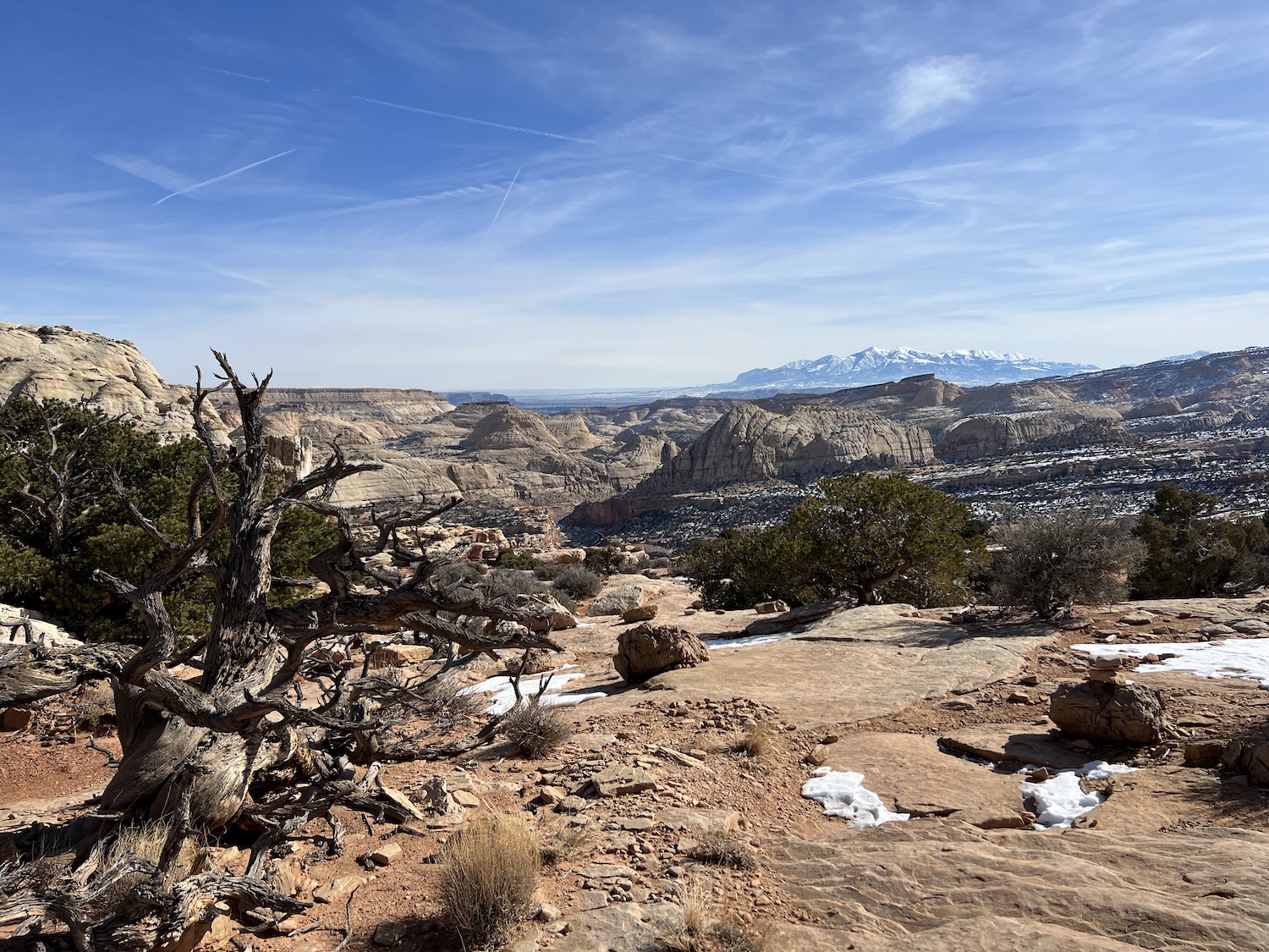 After bobbing and weaving through a wildly eroded landscape, the road descended into Capitol Reef National Park. I hiked up to an overlook through the timeless calm of a winter morning, the valley below and peaks beyond perfect as a painted backdrop.