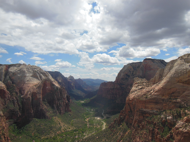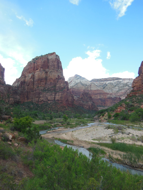 The climb, the crowds, and the wind made the hike up extremely unpleasant. But the views from the top, illuminated by a passing moment of sunshine, were spectacular. North and south, the green stripe of the Zion Valley ran beneath my feet, bounded by the gleaming white and gold sandstone of cliffs. The dark clouds of the rainstorm, passing just to the side of the summit, accentuated the colors of the scene. After fighting my way through the crowds to the base, I walked down to the Virgin River and looked incredulously through the drizzle at the looming ridge I had just climbed. As after hiking up the Half Dome at Yosemite, I couldn’t help thinking: that was fun, but never again.