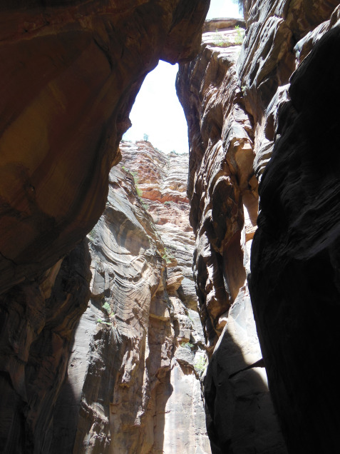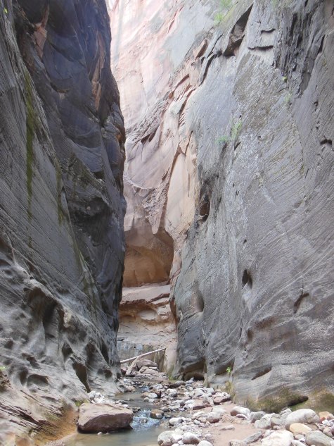 Virtually alone – I was at the head of the first wave of morning hikers –I trudged upstream in twilight of the canyon interior. Only after an hour did the first streaks of sunlight begin to find their way down slot canyons, dappling the surface of the river and revealing intricate patterns in the sandstone walls. I hiked perhaps three miles upstream, until my progress was stopped by a six-foot hole between two huge boulders.