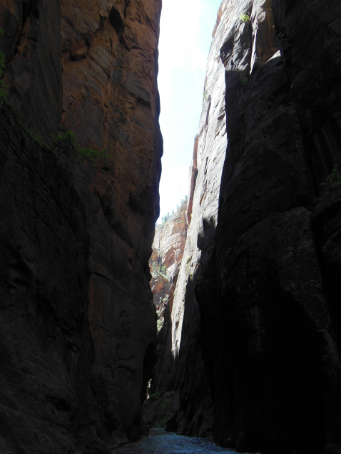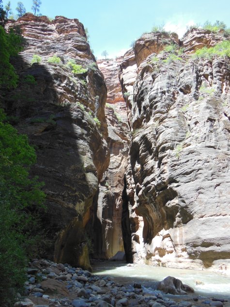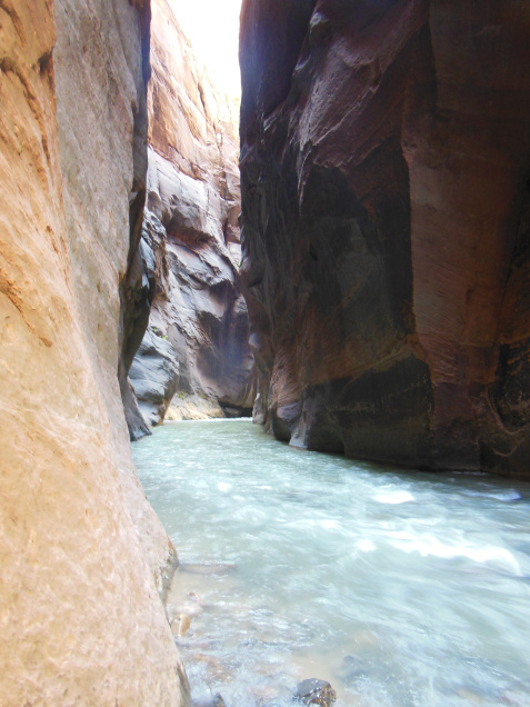 As it gently meanders through the Zion Valley, the Virgin River, chuckling on its bed of pebbles, seems an innocuous little stream. Beyond the valley head, however, where the canyon walls contract into a chasm little more than twenty feet wide, this charming brook is revealed as a powerful mountain stream. This stretch of the Virgin River, whipped to froth between beetling cliffs, is known as the narrows. With Angels Landing, the walk up the Narrows is one of Zion’s iconic hikes. Again with Angels Landing, it is also one of Zion’s most dangerous. Even in high summer, when the flow is often less than a third of what it was today, navigating the slippery river bed and insistent currents of the Narrows requires considerable caution. The higher waters of Spring are correspondingly more hazardous. When I checked a few days ago, the Narrows were closed by high water. They reopened yesterday when the water flow fell below 150 cubic feet/second for the first time in weeks. Since the river was still flowing at 140 cf/s during my hike, however, it was sometimes all I could do to stagger forward into the current.