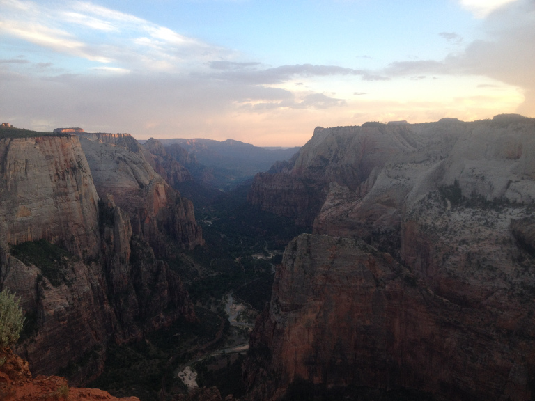 About a half-mile ahead and a thousand feet below, I could see the last ant-sized hikers climbing down from Angels Landing. Beyond, the cliffs of the valley wall, tops splashed with a narrow band of vermillion, stretched toward the distant lights of the visitor center. The Narrows, already dark, sliced off into the plateau on the other side of the overlook. Then the sun set, the vista turned blue and hazy, and I switched on my flashlight for the long walk back to my car.