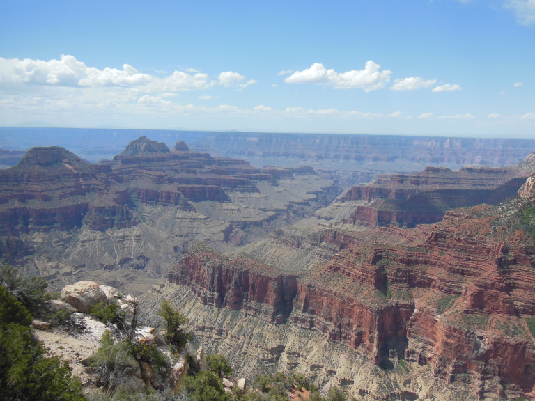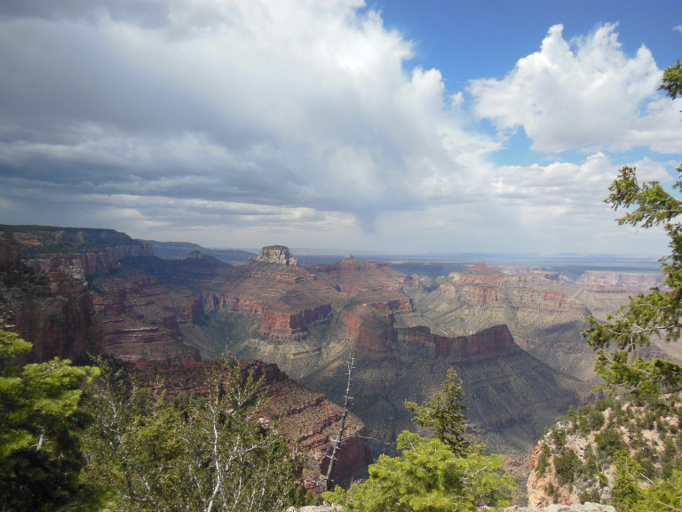 I reserved one of the last spots at the Demotte Campground, about five miles north of the park entrance. Driving into the gate, I was stopped by a herd of rangy-looking buffalo. They passed at a leisurely pace, picking at grass by the roadside and leading a half-dozen clumsy calves. A motorcycle pack jammed the gate; and then, finally, I was in. I drove straight to the visitor center, and walked out to Bright Angel Point, where the canyon itself first became visible. I have seen the Grand Canyon before, and have spent the past two weeks in a landscape molded by the same erosional forces. But I was still astonished by that first look. The scale, already almost incomprehensible, was made even harder to grasp by the hazy air, and by a series of cloudburst drifting across the southern rim. My general impressions are perhaps best epitomized by the biker who walked up beside me, took off his sunglasses, whistled, and said: “holy shit.”