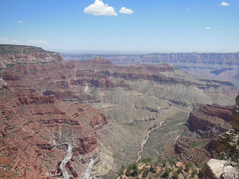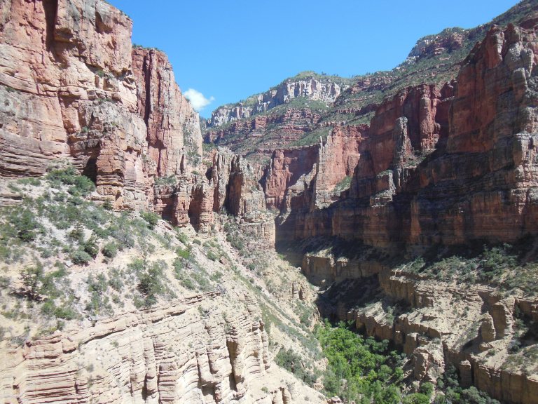 Up just before dawn, I emerged into a landscape whitened by heavy frost. The car thermometer registered 24 degrees as I pulled into the lot for the North Kaibab Trail, the only path on the North Rim that descends into the canyon. The temperature warmed quickly as I descended, as did I, sweating slightly with the effort of keeping walking a steady slope down for more than five miles. Since the path is confined to two side canyons, the scenery consists less in sweeping panoramic vistas than in the humbler drama of trailside geology. One by one, the rock formations of the Grand Canyon walls – Kaibab Limestone, Supai Sandstone, Bright Angel Shale, etc. – pass in review, submitting themselves to this amateur geologist’s close inspection. As I descended and the sun rose higher, the formations rose in sparkling detail above me, three thousand feet and a hundred million years deep.