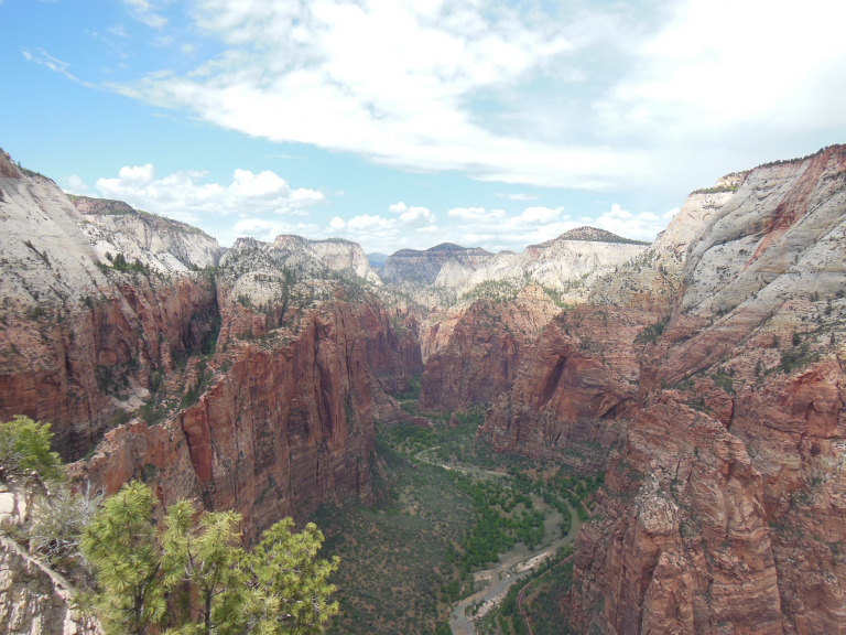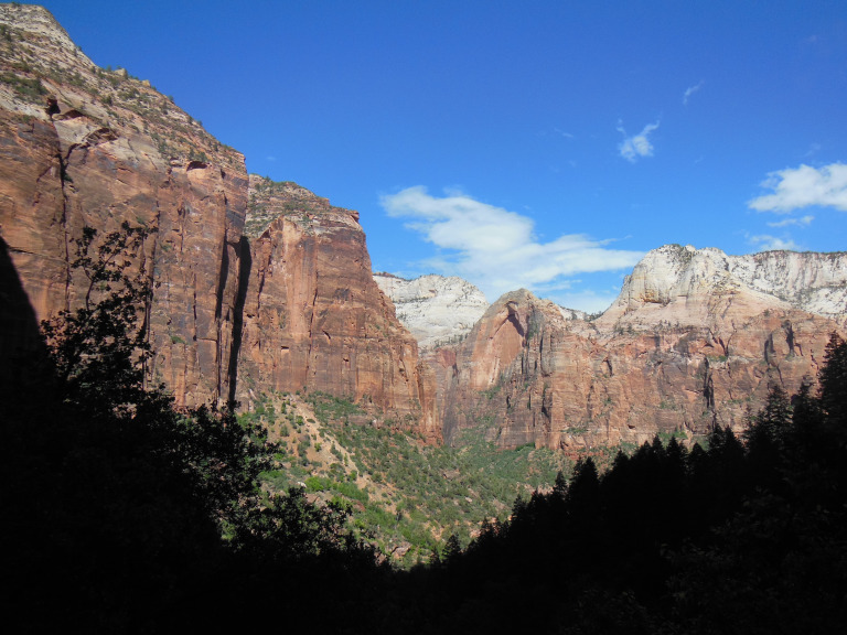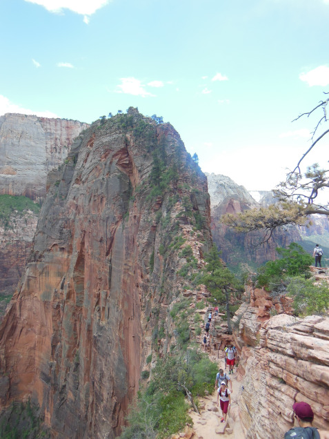 Although it was still before noon on a Friday, crowding in the park had reached crisis proportions. I had to park in the town of Springdale, nearly a mile from the western gate. Jogging back to the park entrance, I joined a long line of people waiting for the shuttles that carry visitors into Zion Valley itself. As a girl in front of me informed her parents – “this is worse than Disneyland!” Once I finally got on a shuttle, I went directly to the trailhead for Zion’s most infamous hike: Angels Landing.