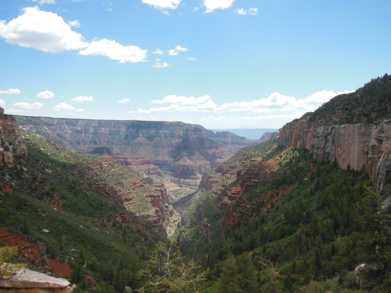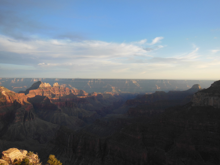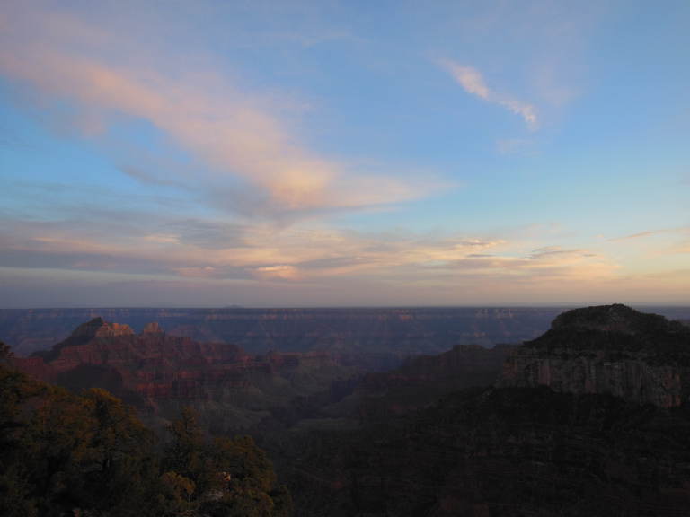 I left Ponderosa early, shaking thorns from my tent and tarp. The ride to the north rim of the Grand Canyon was largely uneventful. After a long stretch of juniper-covered hills, I crossed into Arizona at Fredonia. Passing a gas station with a roadside sign advertising LOTTO GUNS AMMO BEER (a winning combination), I entered a scrubby desert. An overlook nearby provided a spectacular view of the landscape I had just left: three lines of cliffs – the buttery crags of Bryce, the paler hills of Zion, and the crimson buttes of the Vermillion Cliffs National Monument – rose like a colossal staircase mounting to the north. I was entering the southernmost and oldest part of the Colorado Plateau. But not the lowest – the landscape rose into a region of leafless aspens and winter-brown grass, where the air retained a hint of frost.