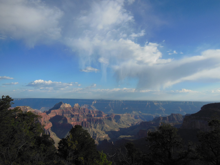 After the obligatory promenade up Bright Angel Trail, snapping innumerable ill-composed photos, I drove out to the overlooks east of the visitor center, which afforded spectacular vistas of the canyon, dappled with clouds. On the eastern horizon, darkened with rain, the Painted Desert shone dully. I especially liked the view from Cape Royal, from which the green stream of the Colorado was just visible among the buttes and crags it had carved.