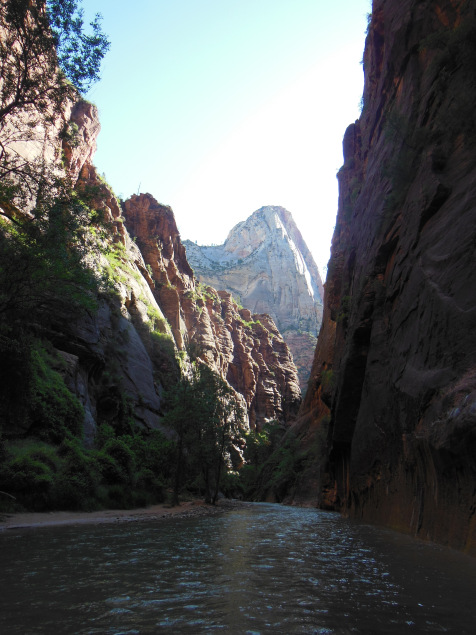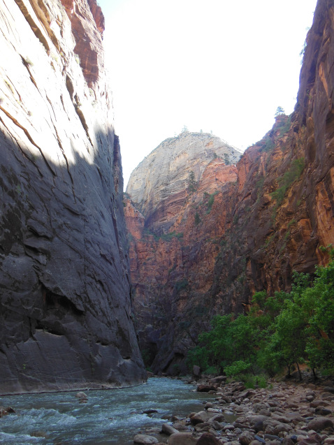 As usual, I was up before dawn, racing through Zion to reach the outfitter in Springdale by the crack of 7. Hiking the Narrows requires special equipment – gripped water shoes, waders, and a hiking stick – and I wanted to get my set before the hordes showed up. I was right to hurry; there was already a line outside the outfitter at 6:45, and the stock of equipment was dwindling fast by the time I left. Waddling over to the shuttles, I made the 45 minute ride out to the mouth of the narrows, and then walked the pleasant mile-long riverside trail to my point of entry. The first hundred yards introduced me to both the gorgeous scenery and the hazards I would experience for the rest of my hike.