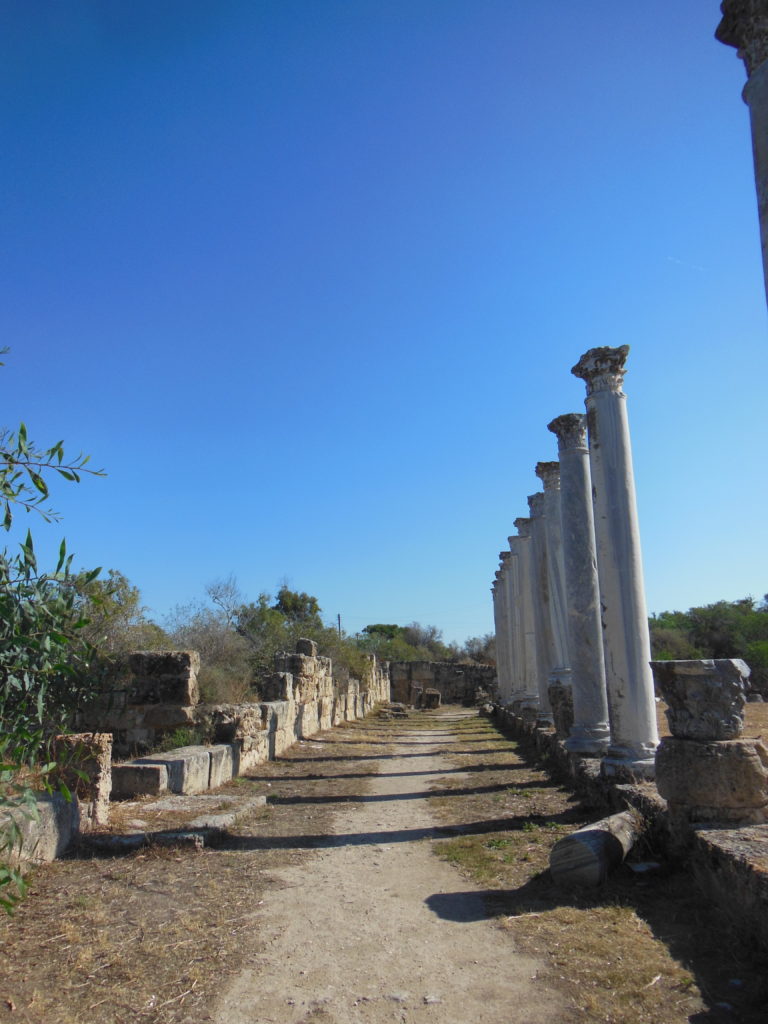 After breakfast, I drove a few miles south to the vast and neglected site of Salamis. For nearly a millennium, this was the cultural, economic, ecclesiastical, and (usually) political center of Cyprus, one of the grandest and wealthiest cities in the eastern Mediterranean. Little of this splendor was evident from the unpaved parking lot, where my car’s arrival scattered stray dogs sniffing for edible trash. A feel of general neglect permeated the excavations; virtually no archaeological work seems to have been conducted here in the forty years since the Turkish invasion, and precious little basic maintenance. The Turkish Republic of North Cyprus has, admittedly, bigger problems than the upkeep of its archaeological sites (such as the rest of the world refusing to acknowledge its existence); and judging from the fact that I saw no other tourists in my four hours onsite, I can’t imagine Salamis is really paying for itself these days.
