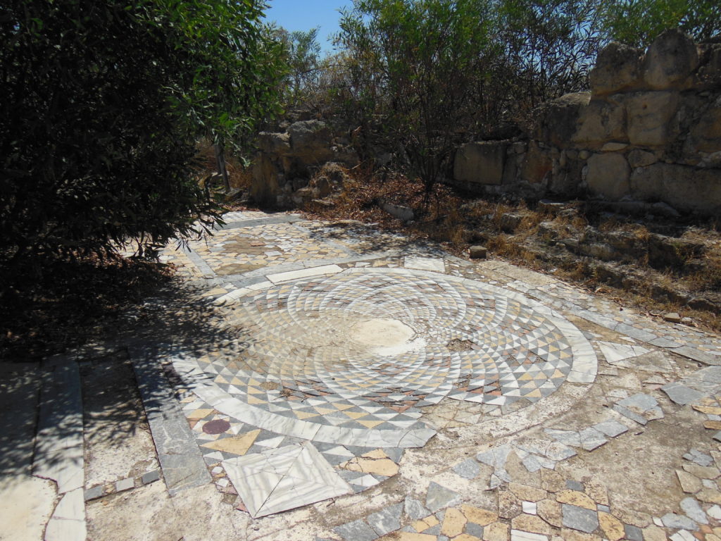 The highlight of my long morning at Salamis was probably the so-called Kambanopetra Basilica. The ruins of this large late antique church – and particularly the beautiful inlaid floors of the adjoining bishop’s palace –were impressive enough; but what made them memorable was the sparkling sea beyond. Fighting my way through thorny scrub to the beach, I walked for nearly a mile along a narrow strip of sand, looking for the remains of Salamis’ harbor. Here and there, lines of ancient masonry were visible through the clear water. Some were clearly the foundations of stone quays; others, half-protruding from the waves some hundred yards from shore, were almost certainly part of the seawall. A fresh breeze off the Mediterranean sighed through dead grass on the dunes over the ancient harbor district; ancient walls emerged from the sand where storms had bitten had into the coastline, and the pebbly margin of the beach was red with fragments of Roman and Byzantine pottery.