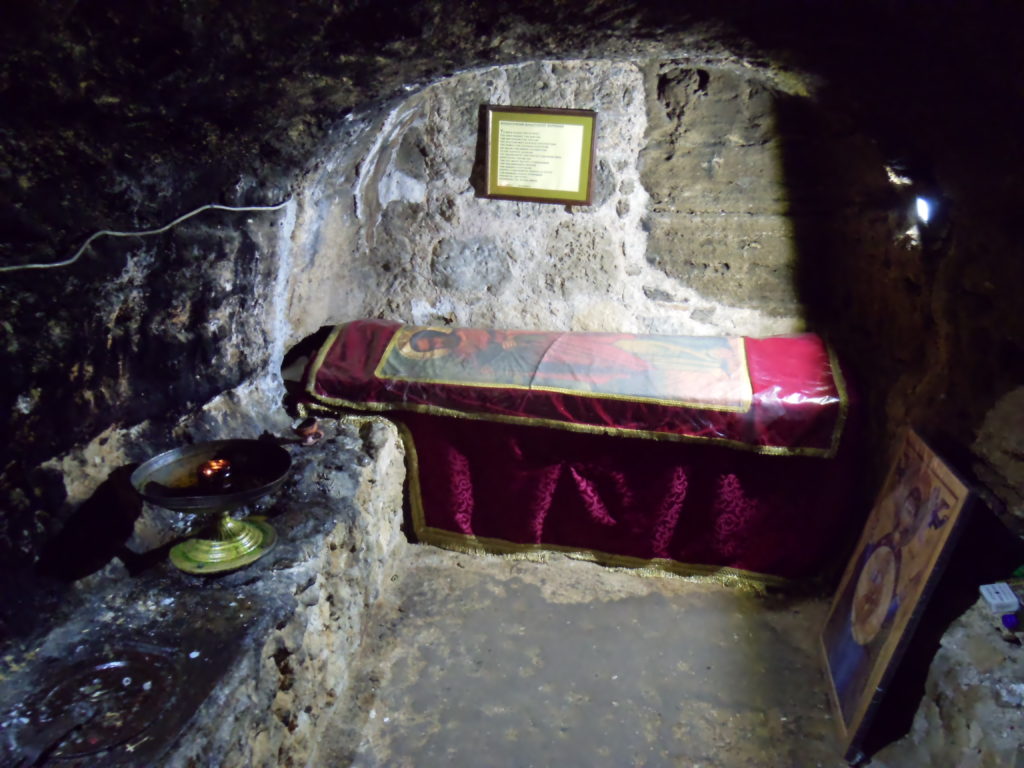 My next stop was the monastery of the Apostle Barnabas, visible from the tombs beyond a series of freshly harvested wheat fields. For centuries, pilgrims traveled from every corner of Cyprus to visit the saint’s remains; and although the sarcophagus has been empty for more than a millennium – the body was removed to Constantinople for safekeeping in the tenth century – Orthodox Cypriots still come here to pray. The martyrion above the tomb is modern; but a narrow stone stair leads to the ancient crypt, where a cluster of icons and votive candles marks the apostle’s former resting place. Beside the shrine is the monastery itself, now re-purposed as the unofficial archaeological museum of northern Cyprus. I was not overly impressed with the collections, which consisted mostly of second-rate icons and ill-labeled pottery; the church and cloister themselves were, however, peaceful and well-maintained – unfortunately something of a rarity in northern Cyprus.