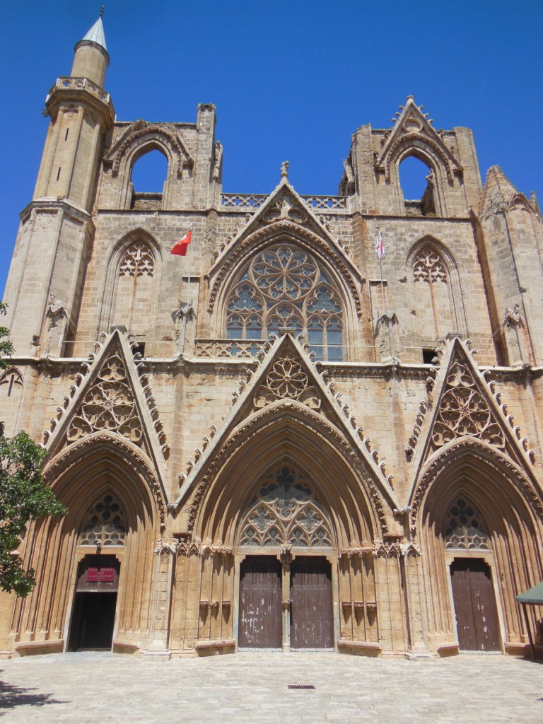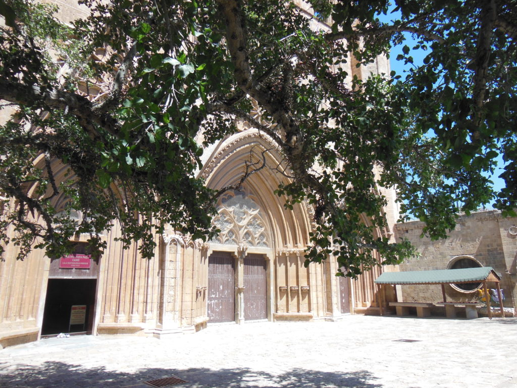 I parked almost in the shadow of the former St. George of the Greeks, a towering Gothic shell whose inner walls still bear faint impressions of frescoes. A few blocks away, the massive Cathedral of St. Nicholas, a mosque since the Ottoman conquest, marks the city center. Although the towers were damaged during the 1572 siege, the exterior remains virtually unchanged from the Lusignan period; I especially admired the carving of the tympanum over the main door. Shedding my shoes beneath an enormous Sycamore Fig (said to be as old as the cathedral), I spent some time in the whitewashed interior, which retains much of its Gothic dignity.