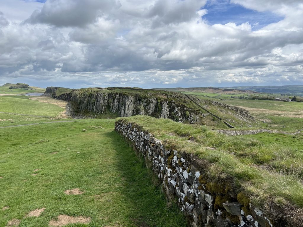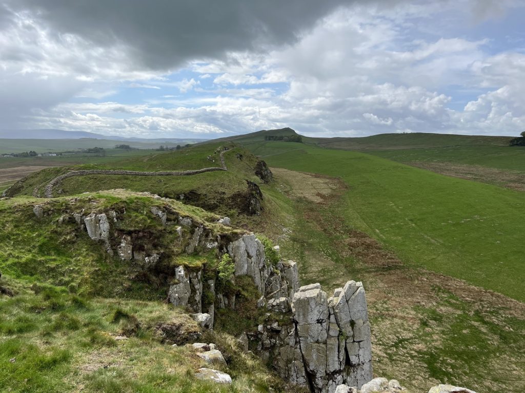 I walked along the wall – seldom more than six feet high, a third of its original height – for several miles. Clouds tumbled overhead and hills rolled away to either side, raked by a cold west wind. About halfway through my walk, a sudden storm lashed the landscape with horizontal rain. Then sun again, and wind.