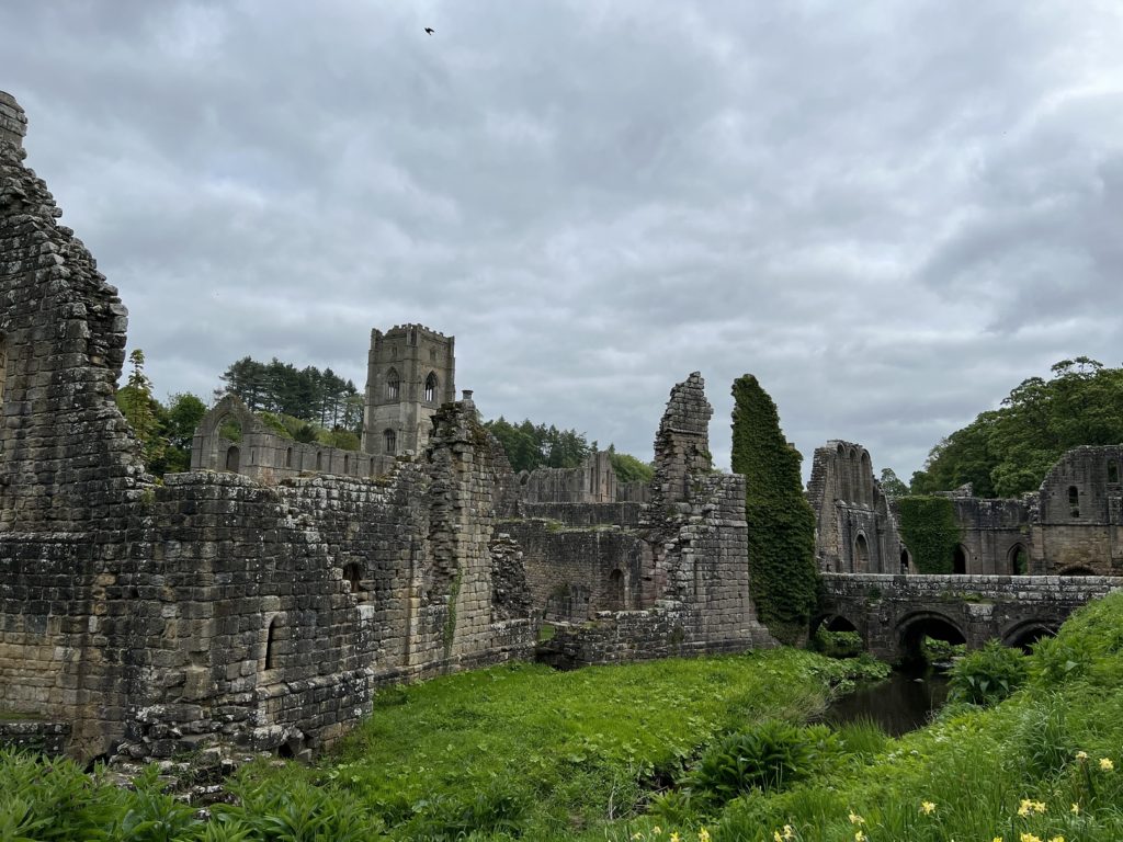 After playing chicken with every tractor in Yorkshire, I finally found my way to a highway with two actual lanes. This brought me through a desolate landscape of heath and dragging clouds, and finally to the monumental ruins of Fountains Abbey, probably the most impressive medieval ruin in England.