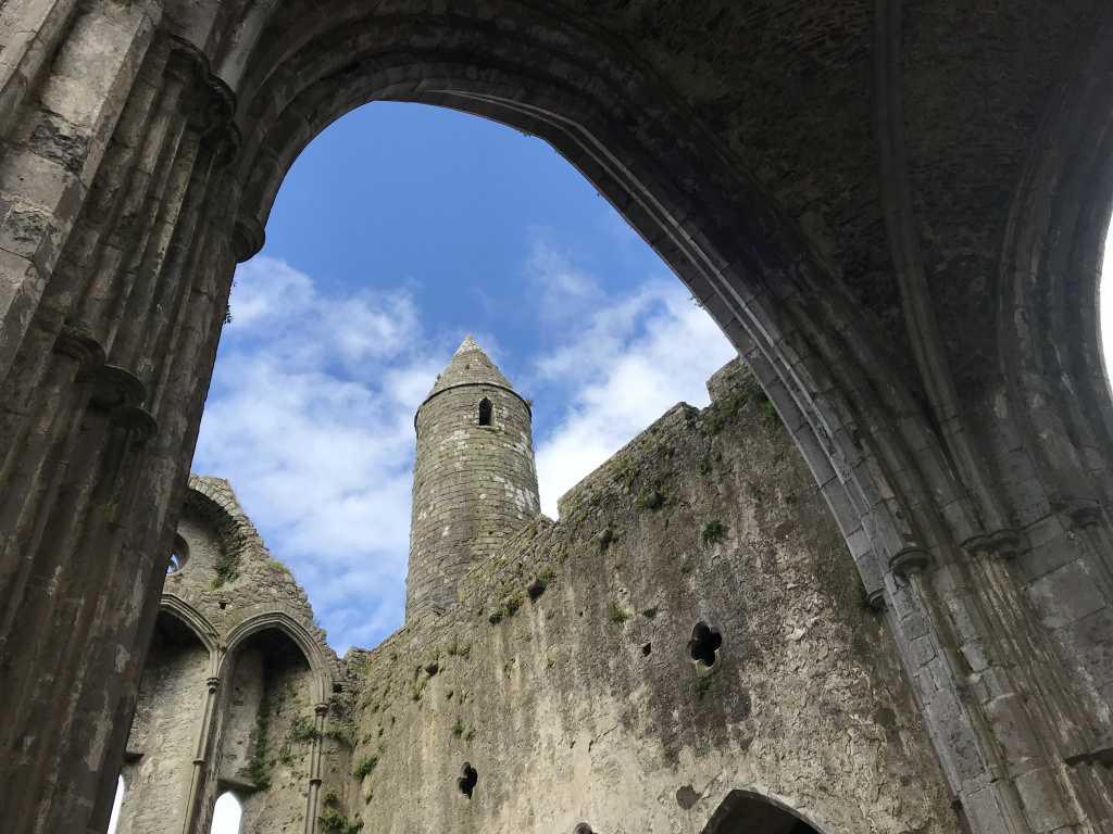 The next stop was Jerpoint Abbey, an impressive medieval ruin with a well-preserved tower and cloister. After a picnic lunch beside the leaning tombs of the Abbey cemetery, we drove to the Rock of Cashel, a hill crowned with the gaunt ruins of a cathedral. Once the chief fortress of the kings of Munster, the Rock was given to the Church in the eleventh century, and has been famous for its ecclesiastical architecture ever since.