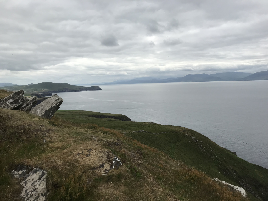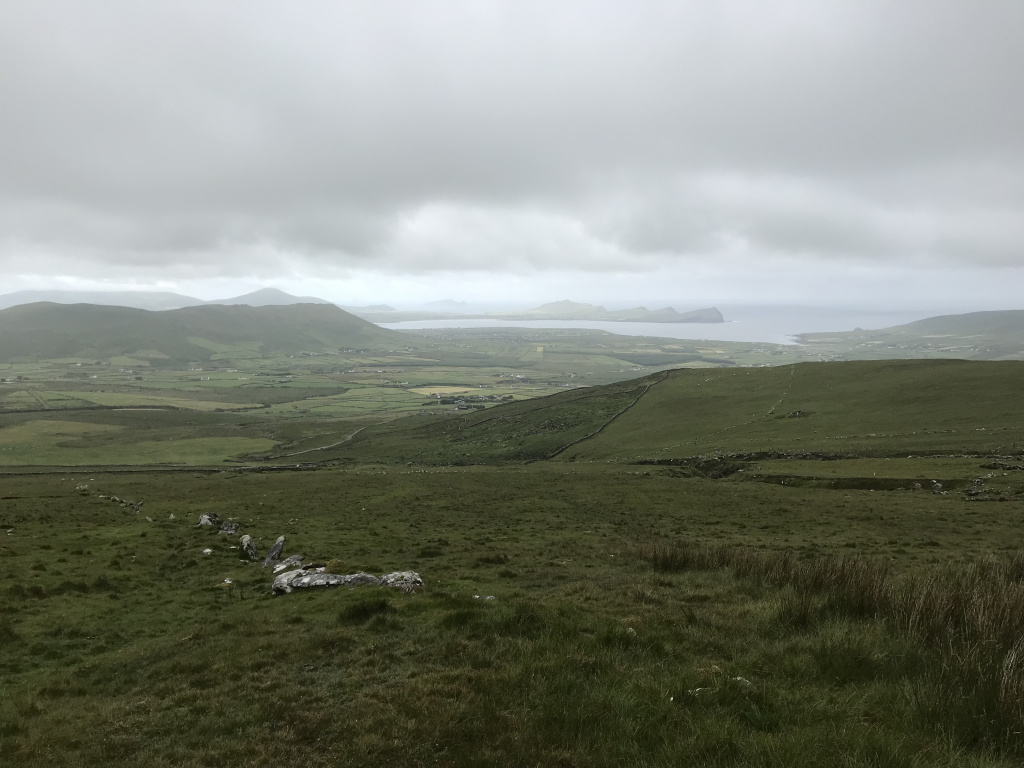 Late last night, I discovered that the path up Mount Brandon, the highest point on the Dingle Peninsula, was only a few miles from our rented house. So I woke early, roused my brother Austin, and drove a series of one-lane roads to the trailhead. From the beginning, the walk was stunning. Ahead hovered the peak, buried in clouds. Behind spread a vast panorama of deep greens and pale blues, fence-checkered hills and wave-lashed cliffs.