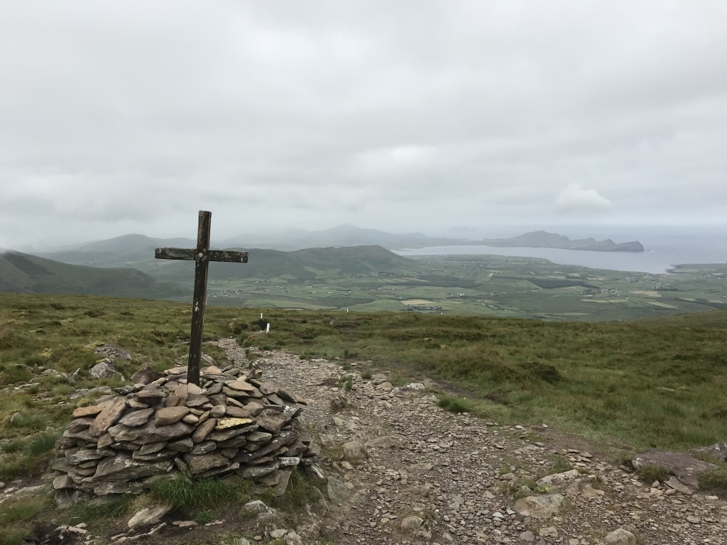 The path Austin and I were following was blazed by medieval pilgrims, who trudged to the summit to visit the remains of a hut supposedly occupied by the semi-mythical Saint Brandon / Brendan. Later generations of pious climbers set up a series of large wooden crosses along the path, which are still used as Stations on Brendan’s feast day.