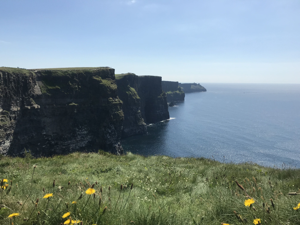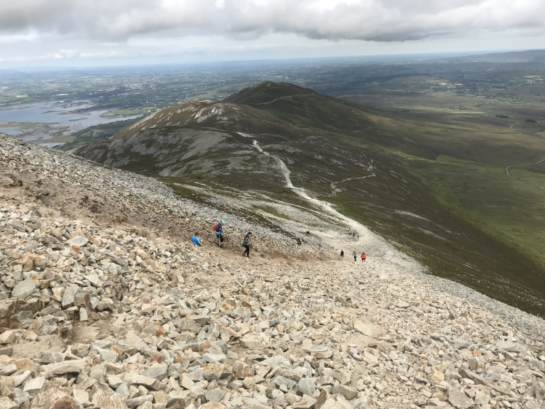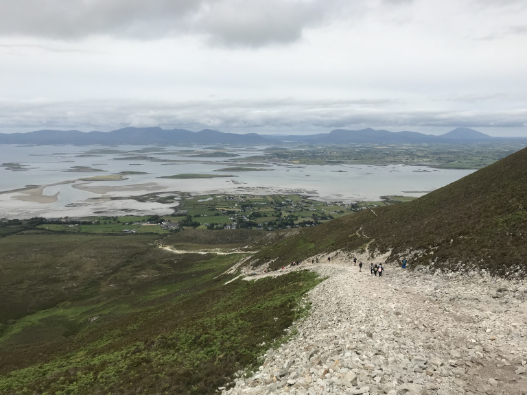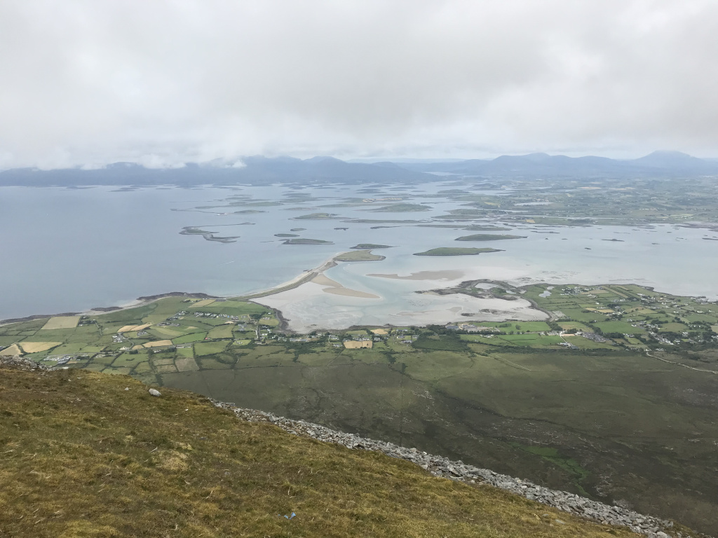 The views from the top were spectacular. Beneath a sea of clouds that just grazed the summit, most of County Mayo was visible. To the north was a broad and islet-speckled bay; to the south, rolling green hills. Immediately below was the white scar of the trail, meandering treacherously back down the mountain. After idly wondering how many of my ancestors had enjoyed the same view (my great-grandfather’s family emigrated from County Mayo), and comforting myself with the fact that my forbearers had managed it barefoot, I began the exhausting climb down.