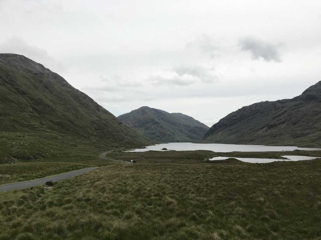 We split up today. While my sister and her husband went riding, and my brothers went drinking, my parents and I made the long drive north to Connemara and County Mayo. An early highlight was the winding, not-quite-two-lane road skirting the eastern edge of Connemara National Park, which had more sheep than cars. After stopping at picturesque Kylemore Abbey, we continued north along another narrow road. This brought us past Doo Lough (Black Lake), a mountain tarn, and up a bleak mountain valley where hundreds of starving Irish died during the Great Famine. A cross marks the site of the tragedy.