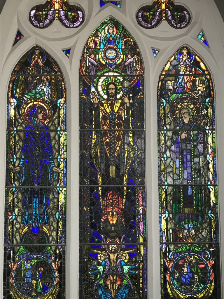 After riding around the castle and watching a falconry demonstration, we rode into the nearby town of Cong, best-known as a filming location for the Quiet Man. I was more interested in the ruins of the medieval abbey just outside town, and in the splendid Art Nouveau windows of the village church.