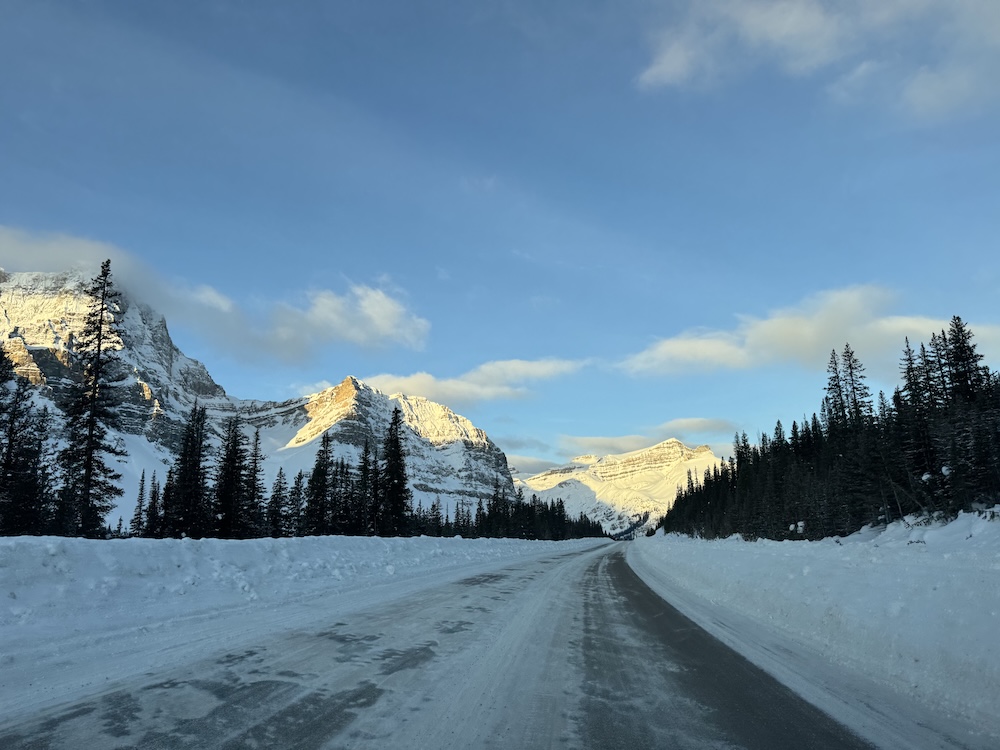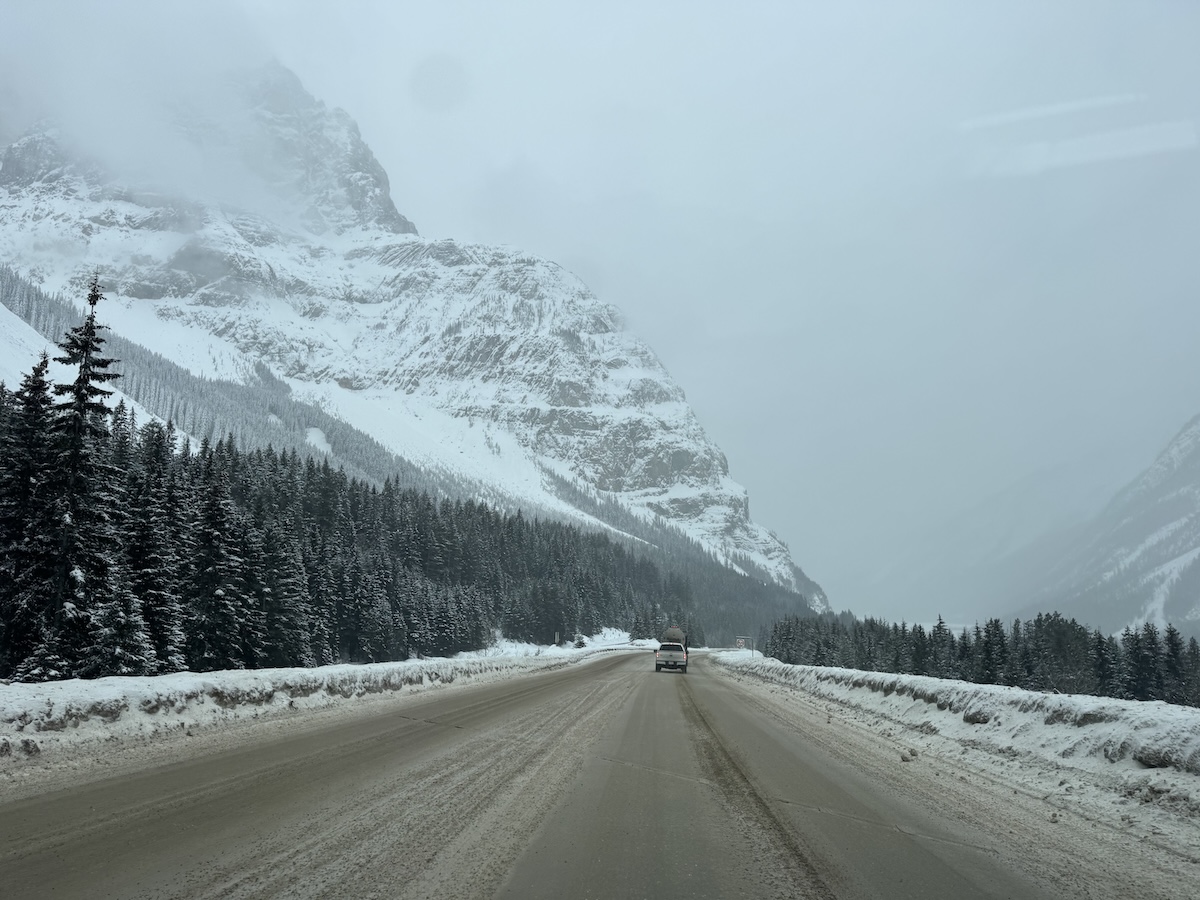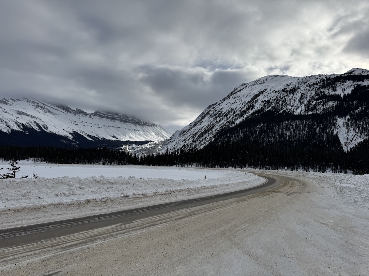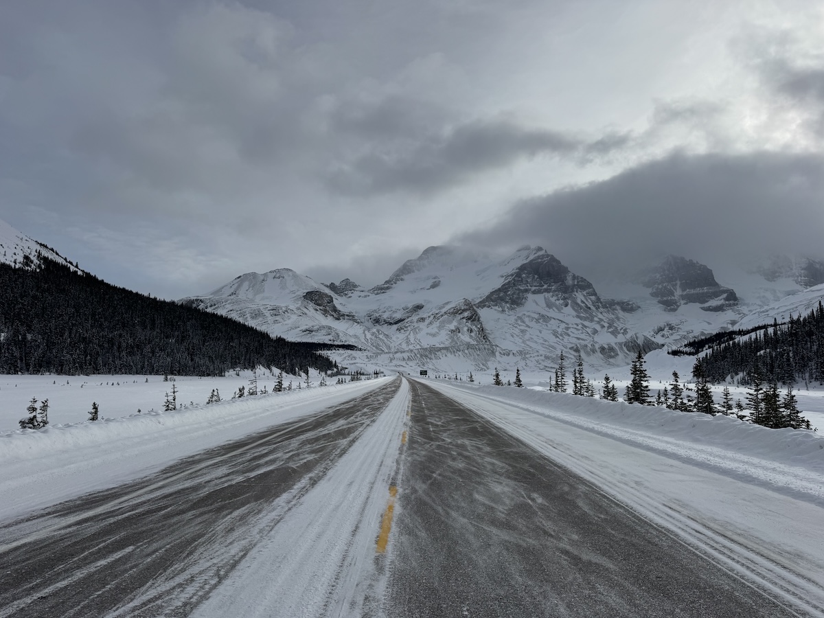 Leaving the cozy confines of the Super 8 in the predawn chill, I followed the Trans-Canada Highway west, past Banff and Lake Louise, to the entrance of the Icefields Parkway, Canada’s most iconic scenic drive. The sign at the entrance booths announced POOR road conditions. The pavement, I quickly discovered, was almost completely covered with ice and packed snow. But it was only treacherous if you weren’t paying attention.