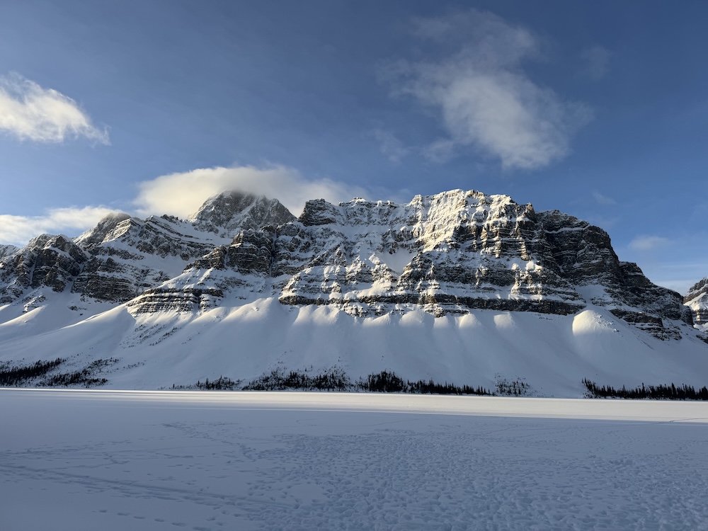 I wasn’t paying attention, because the landscape opening on either side of the road was staggeringly beautiful. Under a clear and brightening sky, mountains reared – jagged, sheer, shining with snow. As the sun crested the peaks, with the temperature just above zero, I stopped at Bow Lake. Pines rose on every side, limbs freighted with snow. High on the mountain wall across the lake, the cobalt ice of a glacier gleamed.
