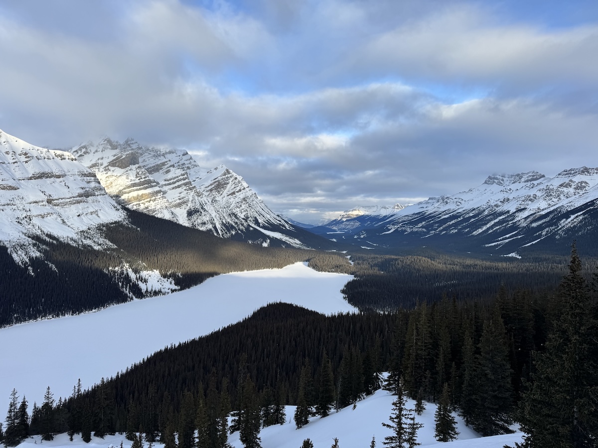 My next stop was Peyto Lake, probably the most famous beauty spot on a highway packed with them. The trail was deserted. When I reached the snow-shrouded viewing platform, I found myself overlooking a vast and lonely valley, with a glacier on one side and the frozen lake below. I stood there a while, listening to the wind.