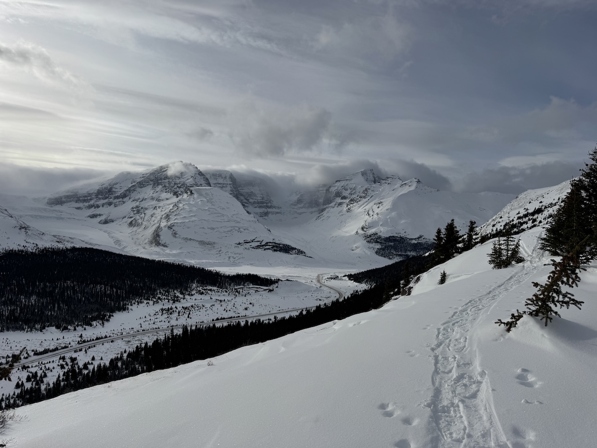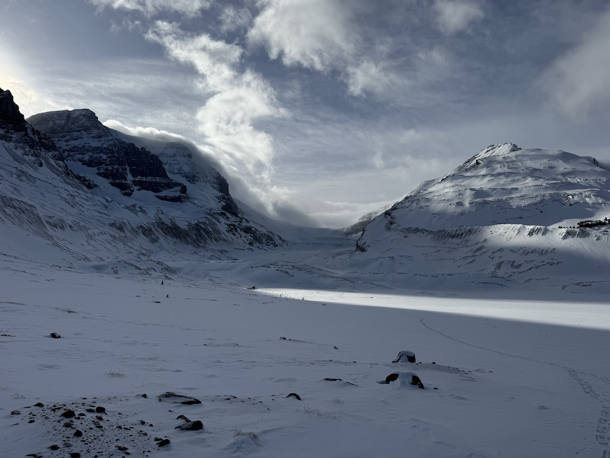 After driving to the north side of the Icefield, I backtracked to Wilcox Pass, just beyond Athabasca Glacier. The trail overlooking the pass is one of the finest in the park. Unfortunately, it was buried beneath four feet of snow – and I had neglected to bring snowshoes. I was forced to struggle up, post-holing to my knees at every other step, sometimes almost swimming in snow. When I finally made it to the ridge, legs aching and will fading, I was treated to a view of Athabasca Glacier, crowned by a boiling mass of clouds. To the west, the sun was just setting behind a jagged rampart of peaks. Beneath, almost lost in the sea of white, was the black ribbon of the parkway.