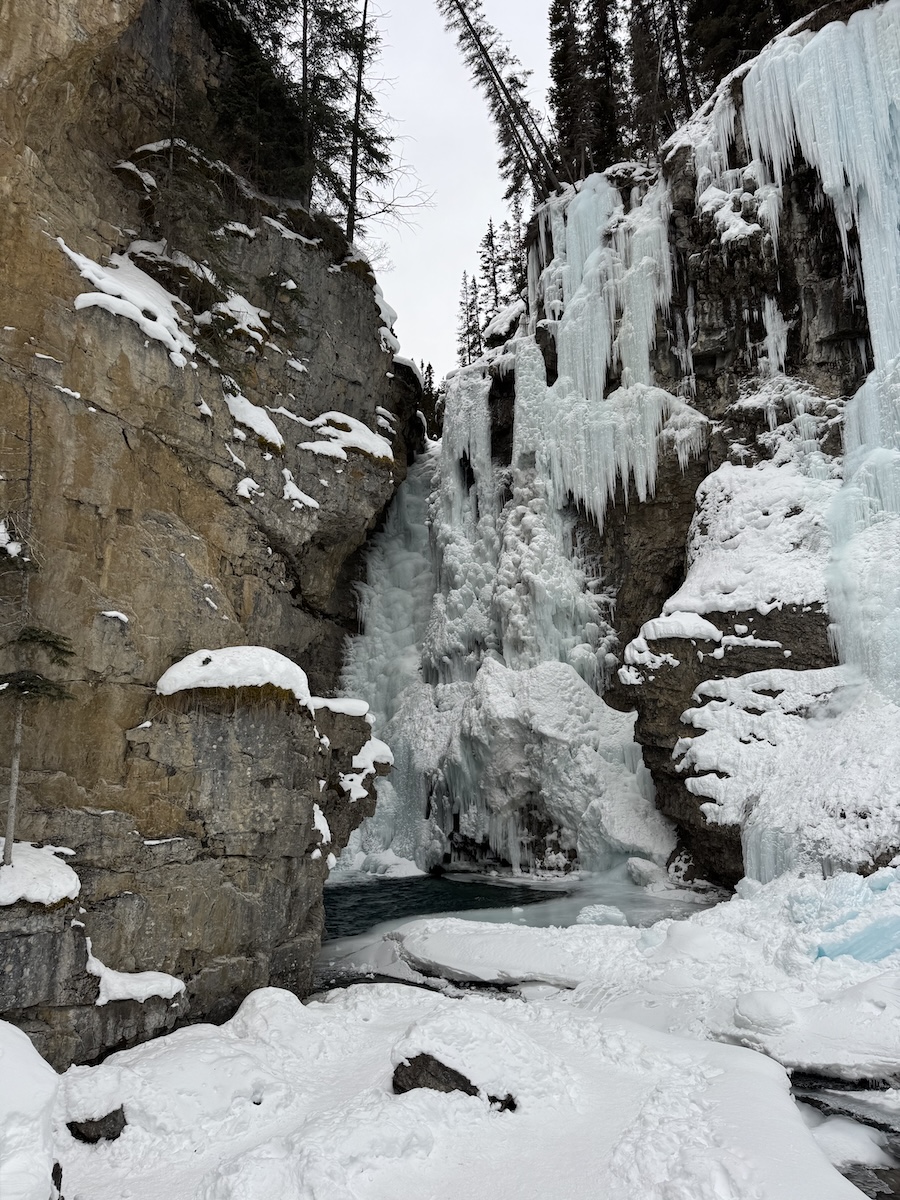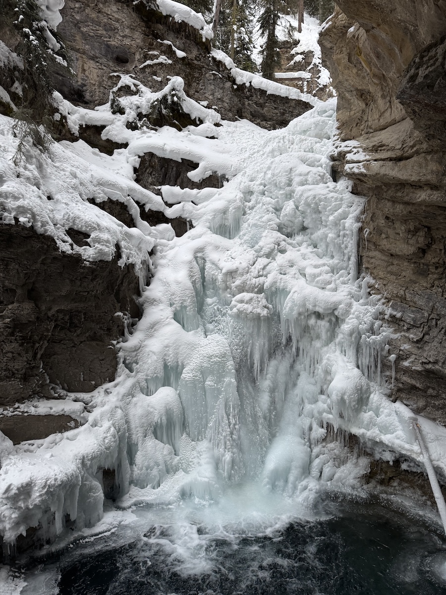 I was one of the first cars in the large parking lot – very crowded in summer – for the Johnston Creek Trail. Strapping on my cleats, I followed the ravine, the babbling creek at its base just audible through pockets in the ice. In places, the trail was cantilevered over the canyon, and the rockface on the other side, draped with pale blue icicles, was almost close enough to touch. Although the lower falls were completely sheathed in ice, water was still tumbling beneath and boiling in the open pool blow.