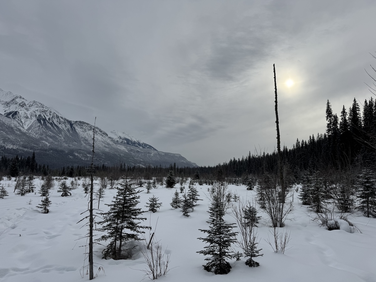 The snow had dwindled to flurries by the time I reached Yoho National Park on the far side of the divide. Parking in a small and icy lot, I followed the snow-covered access road to the trail for Wapta Falls, one of the largest cascades in the Rockies. Along the way, I detoured to a snowy meadow, where a hazy sun presided over a dramatic mountain vista.