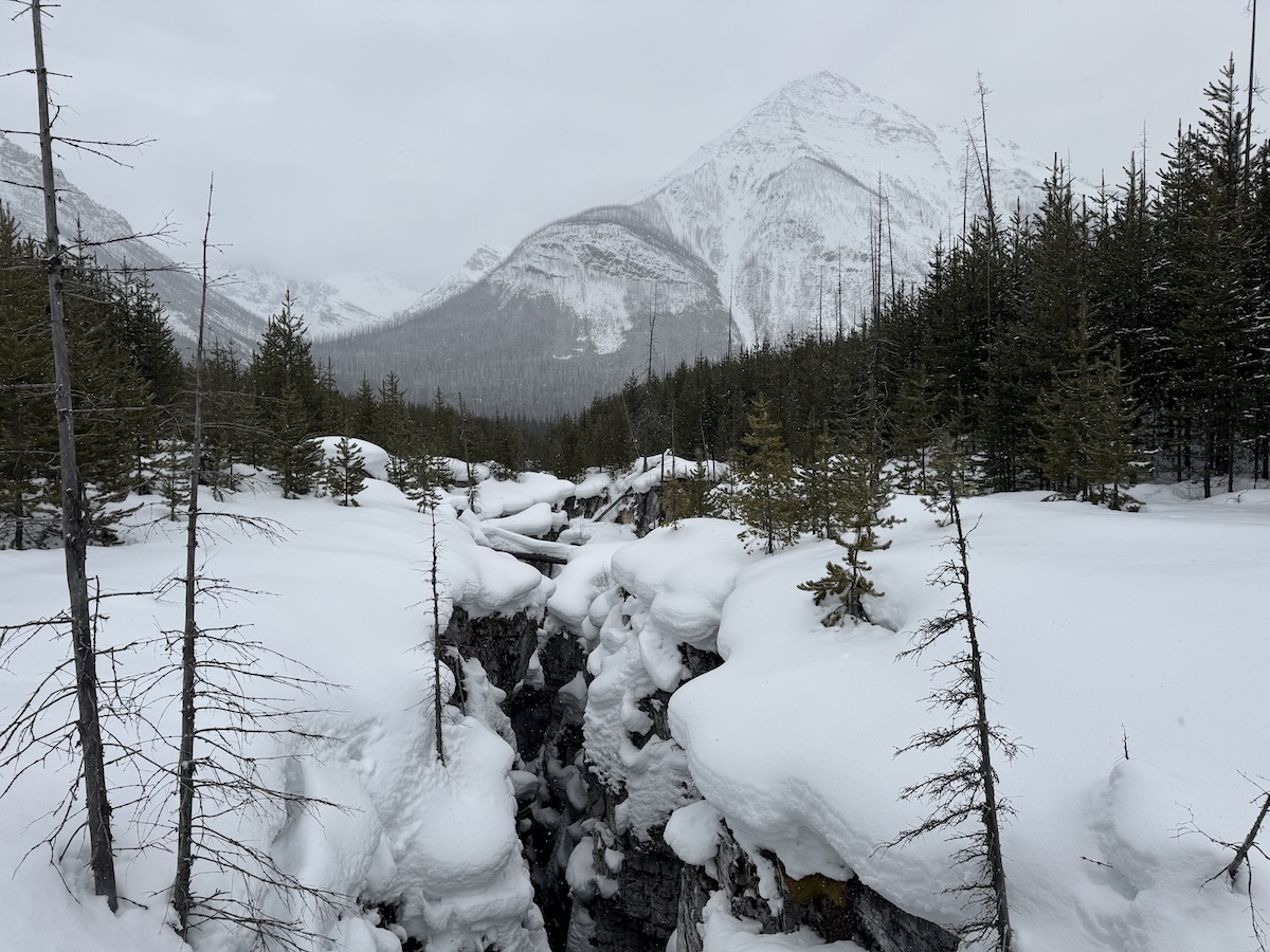 Crossing back over the Divide, I made my way to Kootenay National Park, just west of Banff. It was snowing again, and fat flakes drifted over mountains scarred by fire. With time for only a single short hike, I stopped at Marble Canyon. It was a magical place. Snow was falling heavily, drifting through the pines and over the trail. The canyon was a deep gorge, almost narrow enough to leap over, cut by a pale blue creek. Over the ravine loomed a conical mountain, hazed by the snow. The only sound was the rasp of flakes on my hood.