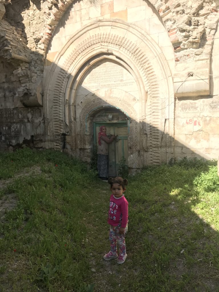 The dirt track up to my next destination, the little Kurdish village of Yedi Kilise, was also guarded. As I pulled into town, I found the road blocked by a two year old girl with folded arms. We faced each other down for a full minute, until her mother came running out of a nearby house and picked her up. This woman, fortunately, had the keys to the ruined monastery I had come to see, and led me there, daughter in tow. Virtually all of the frescoes inside were gone, but sunlight spilling through the shattered domes lent a sense of grandeur to the interior. As I walked from chapel to chapel, trying to take pictures in the semi-darkness, the little girl – fascinated by this strange creature with torn pants and a floppy hat – followed from a cautious distance. Nice to have an admirer…